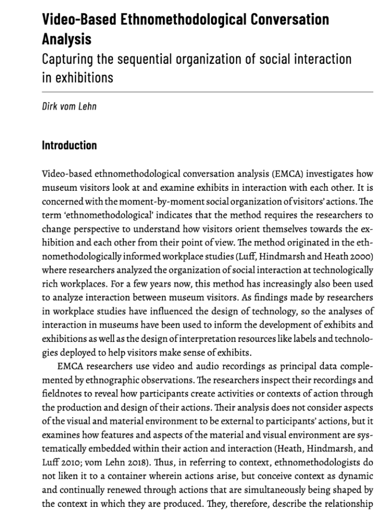 ———. ‘Withdrawing from Exhibits: The Interactional Organisation of Museum Visits’. In Interaction and Mobility: Language and the Body in Motion, edited by Pentti Haddington, Lorenza Mondada, and Maurice Nevile, 65–90. March. Berlin: de Gryter, 2013.
