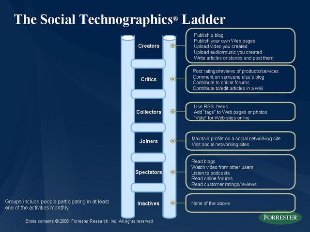 The lecture implied a range of possible research questions. The research the lecture has been based on, origins from studies conducted by research companies who aim to inform management practice and marketing strategies. Detailed academic research can contribute to this research by unpacking the concepts and foundations of relationships this research is pointing to. For example, the Social Technographics Ladder developed by Forrest Research (see Li & Bernoff 2008) creates a typology of people according to the ways in which they use Social Media tools, such a blogs, podcasts or RSS feeds. Little do we know of how people actually ‘read’ and ‘collect’ Social Media content, what resources they draw on and how they use these resources to create new content and new forms of content.