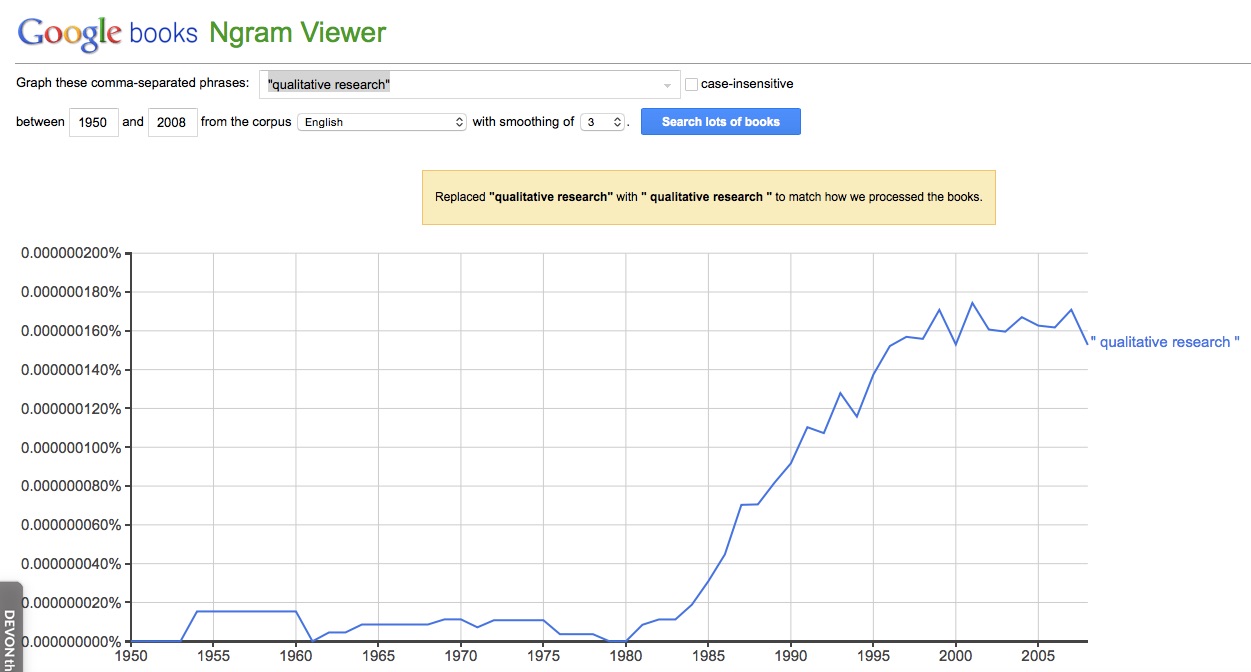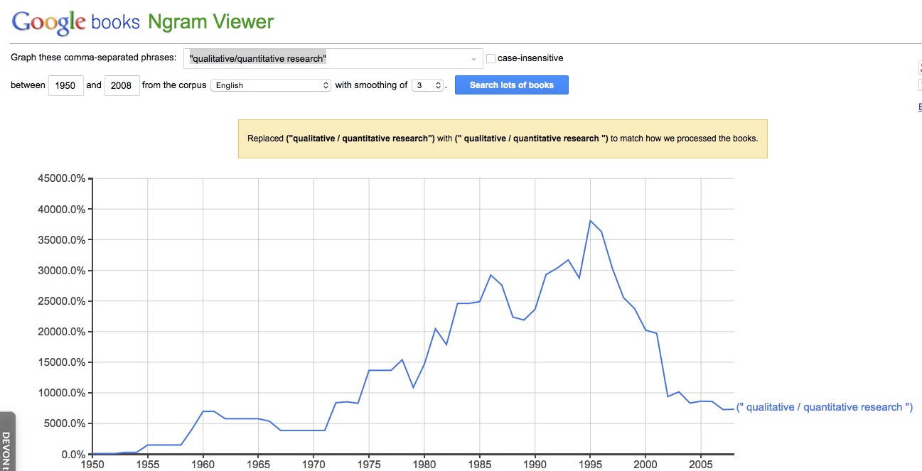 There is plenty of debate about the ‘quantitative/qualitative divide’ in the social sciences. Howard Aldrich has written an excellent piece arguing to abolish the distinction, and thereby reinvigorated the debate, for example on OrgTheory and Work in Progress. A quick look at Google’s Ngram viewer is quite interesting. For “qualitative research” it shows